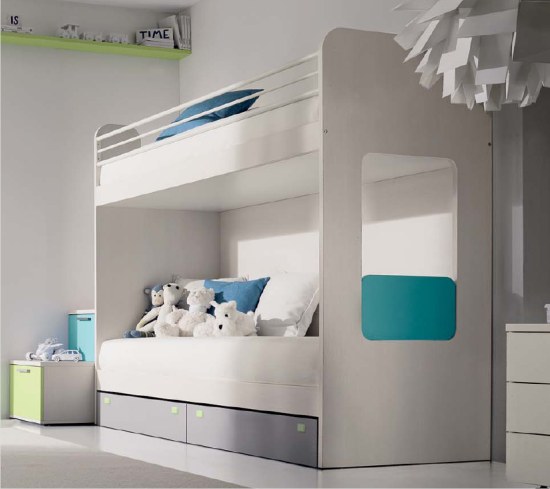Accessori: corrimano per scala, mensola con divisori, cassettoni porta giochi, terzo letto estraibile, sistema a rete superiore ribaltabile (per agevolare il rifacimento del letto in caso di mancanza di pedana posteriore).