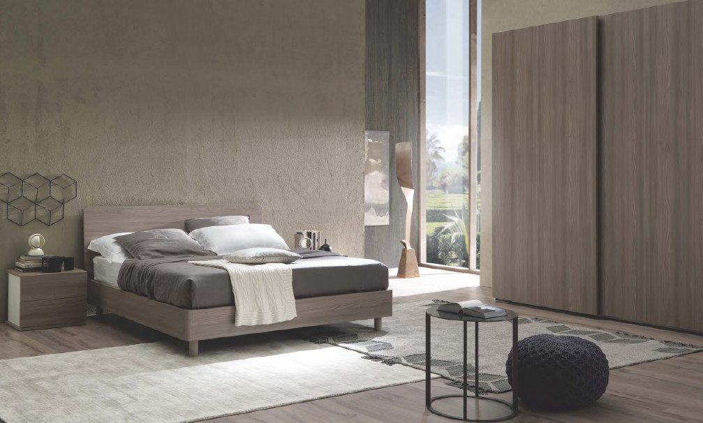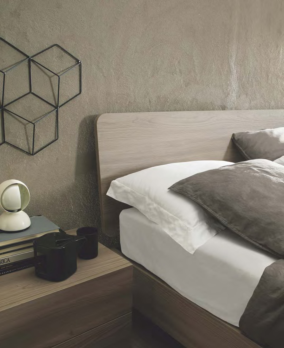 Finiture disponibili: giroletto in nobilitato liscio e poro aperto di serie, laccatura opaca, testiera disponibile imbottita in tutte le categorie di tessuto ed ecopelle.