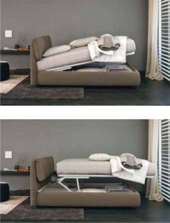 Per massimizzare la funzionalità si può avere Chantal in versione letto matrimoniale con contenitore, che sfrutta il suo volume nella stanza con un capiente box. La rete a doghe si solleva con un movimento oppure si può scegliere il meccanismo a doppia alzata, ideale anche per poter rifare il letto senza chinarsi.