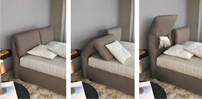 Chantal è un letto imbottito matrimoniale che rendea prima vista l’atmosfera di comfort e morbidezza che riesce a donare alla camera da letto. La testiera è caratteristica sia per il design, dato dalla curva dei cuscini, sia per la funzionalità: è possibile piegare e muovere la cuscinatura per renderla un comodo appoggio, ideale per leggere a letto.